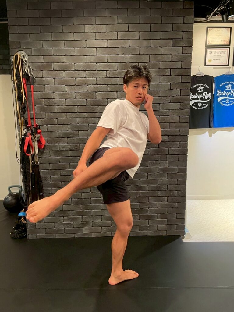 - 当てる:すねをターゲットに当てる。膝は軽く曲げたままでOK。蹴る瞬間に右手を下へ振り、左手はガード位置へ戻してバランスを取る。